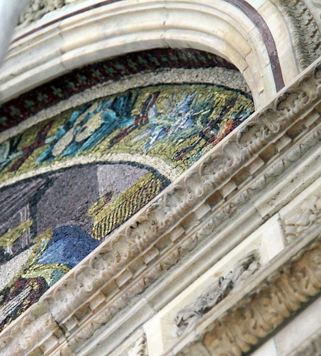 Il restauro sarà presentato il 5 giugno ma oggi una ventata ha svelato i particolari del recupero della Porta della Mandorla del Duomo di Firenze, rimasta chiusa per i lavori di recupero per 10 anni. Viene considerata la più bella delle porte del Duomo. E’ il capolavoro di Nanni di Banco degli anni a cavallo tra il 1300 e il 1400, ma alla “Porta della Mandorla”, che prende il nome dalla aureola gotica a forma di mandorla, lavorarono maestri di diverse generazioni tra cui Donatello, Giovanni Tedesco, Lorenzo d’Ambrogio, Niccolò di Pietro Lamberti e Bernardo Ciuffagni e, forse, anche un giovanissimo Luca Della Robbia. Opera indiscussa di Nanni è la Madonna Assunta che porge la sacra cintola a San Tommaso, mentre nell’angolo inferiore destro un misterioso orso s’arrampica ad un albero. Ad essere restaurata non è solo la porta, ma anche una porzione di 700 metri quadri della facciata. (Foto Gianni Paquini Cge)