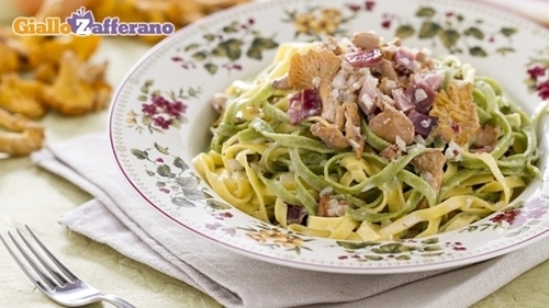 Le tagliatelle paglia e fieno al ragù di finferli e speck sono un primo piatto con ingredienti tutti tirolesi: i finferli, o gallinacci, sono funghi tipici di quella zona, e si trovano nella tarda estate e all’inizio della stagione autunnale, mentre lo speck è il vanto dell’Alto Adige.