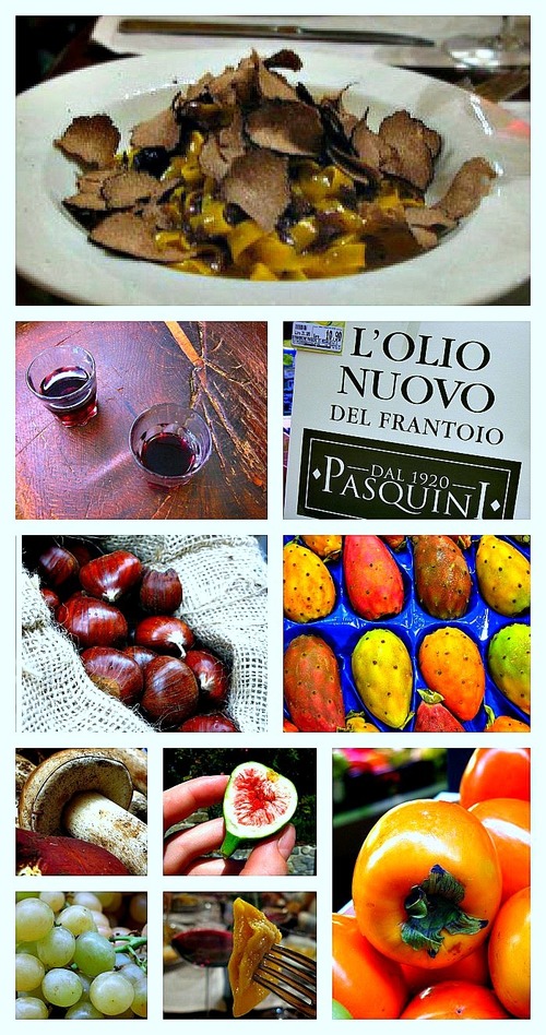 I Tartufi (EE tar-TOO-fee / Truffles) Il Vino Novello (EEL VEE-noh noh-VEHL-loh / New Wine) L’Olio Nuovo (LOHL-ee-oh NOO-oh-voh / New Olive Oil) and Le Olive (LEH oh-LEE-veh / Olives) I Funghi Porcini (EE FOON-ghee pohr-CHEE-nee / Porcini Mushrooms) I Fichi (EE FEE-kee / Figs) Le Castagne or I Marroni (LEH cah-STAH-nyeh or EE mah-ROH-nee / Chestnuts) and Il Castagnaccio (EEL kah-stahn-YAHCH-cho / Chestnut Flour Cake) Schiacciata con l’Uva (skeeach-CHA-tah AHL LOO-vah / Grape Tuscan Bread) and L’Uva (LOO-vah / Grapes) Le Zucche (LEH ZOO-keh / Squash or Pumpkin) I Cachi or I Diosperi (EE CAHK-ee or EE dee-OHS-pehr-ee / Persimmons) I Fichi d’India (EE FEE-kee DEEN-dee-ah / Prickly Pears) READ