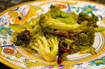 The ripassare technique, perhaps the most common in central and southern Italian vegetable cookery, in which parboiled vegetables are then sautéed in garlic-infused oil. The result is a rather soft and mellow vegetable that readily absorbs the taste of its cooking medium. Today we will take a look at a technique (strascinati, literally “dragged”) where you simply skip the initial parboiling and sauté the vegetable—typically, broccoli—resulting in a much firmer texture and ‘nuttier’ more intense flavor. This technique, typical of Rome, though perhaps not the prettiest way to make broccoli, it is one of the tastiest.