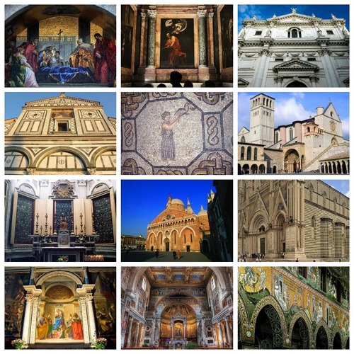 Venice - 12th-century Mosaics, St Mark’sVenice - Tintoretto: The Last Supper and The Fall of Manna, San Giorgio MaggioreVenice - Giovanni Bellini: Madonna & Child with Four Saints, San ZaccariaVenice - Titian: Annunciation and Transfiguration, San SalvadorAquileia - Floor mosaic, Basilica of Santa Maria AssuntaRome - Michelangelo, Pietà, St Peter’sRome - Caravaggio, St Matthew, San Luigi dei FrancesiRome - Mosaics, Santa PrassedeRome - Bernini, St Teresa, Santa Maria della VittoriaRome - Raphael, Sibyls, Santa Maria della PacePadua - Donatello, Sculptures, Basilica of Sant’AntonioAssisi - Giotto, Life of St Francis, Basilica of San FrancescoSpello - Pinturicchio, life of Mary and the Child Jesus, Santa Maria MaggioreCorciano - Perugino, Pala di Corciano, Santa Maria AssuntaOrvieto - Façade, Duomo, OrvietoFlorence - Pontormo, Deposition, Jacopo Santa FelicitaFlorence - Chapel of the Cardinal of Portugal, San MiniatoNaples - Pietro Cavallini, Crucifixion, San Domenico MaggioreOtranto - Mosaic floor, Pantaleone Santa Maria AnnunziataMonreale, Sicily - Mosaics, Santa Maria Nuova