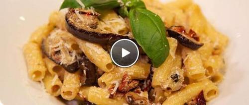 Kook de pasta volgens de bereidingswijze op de verpakking, giet af en bewaar een pollepel van het kookvocht. Wel de gedroogde tomaten circa 5 minuten in warm water. Snijd de bosui in smalle ringen. Pel en hak de knoflook grof. Halveer de chilipeper in de lengte, verwijder de zaadlijsten en snijd de peper fijn. Verhit olijfolie in de grote pan en fruit de bosui, knoflook en peper. Snijd de aubergine in plakken van circa 1 centimeter dik en bak mee. Breng op smaak met zout. Snijd de gewelde tomaten in kleine stukjes en voeg samen met het water toe. Stoof op laag vuur 5 tot 10 minuten tot de aubergines gaar zijn. Rooster de pijnboompitten goudbruin in de kleine pan. Pluk en scheur de blaadjes basilicum. Roer de basilicum, pasta en pijnboompitten door de aubergines. Roer de ricotta en het bewaarde kookvocht van de pasta erdoor.