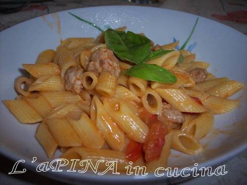 pasta salsiccia e pomodorini …aggiungere la salsiccia tagliata . Rosolare la salsiccia..cuocere le mezze penne rigate al dente..pomodorini