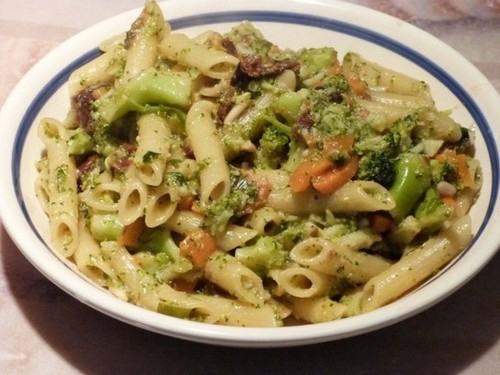 Aggiungo i pomodori secchi tagliati fini e le cimette di broccolo… passati 5-6 minuti aggiungo la pasta e copro con acqua (dovete coprirla completamente ma non esagerare… magari le prime volte preparatevene dell’altra in …