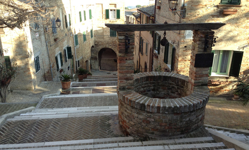 Le città marchigiane la sanno lunga in fatto di scale (chi ha studiato a Macerata o Urbino può testimoniarlo) ma decisamente quella di Corinaldo conquista un posto tra le più belle e suggestive. Corinaldo, comune di poco più di 5 mila anime della parte nord della provincia di Ancona, vanta il primato di essere sia una Bandiera Arancione del Touring Club Italiano, sia uno dei Borghi più belli d’Italia. Oltre al famoso pozzo (foro di copertina) tutta la struttura urbanistica è di rilievo. La cinta muraria, una delle meglio conservate della regione, offre la possibilità non solo di una bella passeggiata ma anche di scorci panoramici notevoli sulla campagna. Un paio di torrioni circolari e il particolarissimo sperone del IV sec la cui fisionomia si inserisce con decisione nell’andamento morbido della cinta muraria. La piazza alberata nel punto più alto del paese offre diverse abitazioni molto curate e una targa ci ricorda che Corinaldo diede i natali a Santa Maria Goretti (bambina vittima di una brutta storia di violenza consumatasi nelle campagne laziali) con un santuario a lei dedicato e dove il suo aguzzino – pentito – è sepolto. Un’ultima chicca della città la trovate in una via parallela alla scalinata sulla destra. È la casa di Scuretto, che si consumò tutti i soldi che il figlio gli mandava dalle Americhe al bar invece di impegnarli nella costruzione della casa, di cui rimane solo la facciata e una simpaticissima targa che racconta la storia.