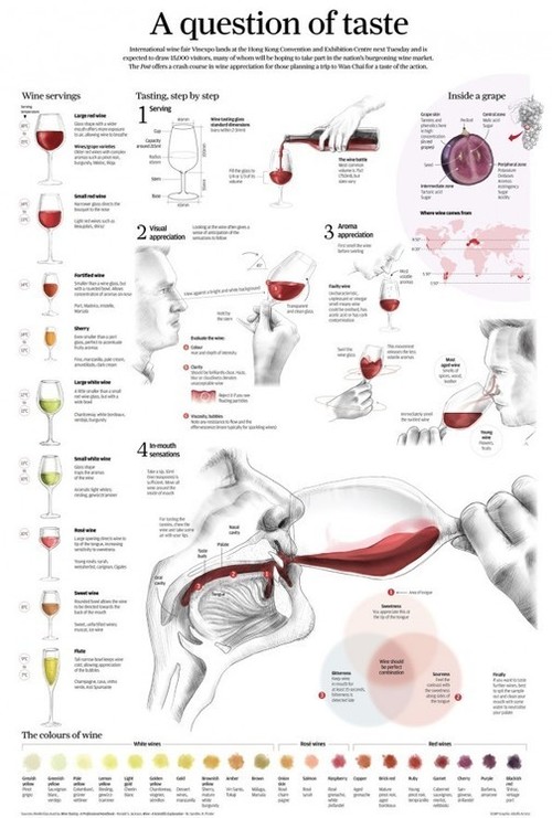 How drink and taste a glass of wine. All kind of glasses and the different grapes and wines.