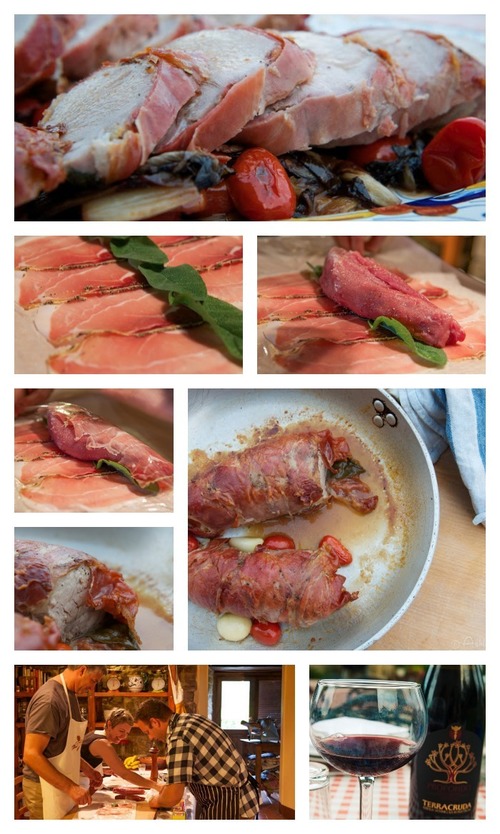 1 tenderloin of pork5-8 slices of prosciutto (depending on how big your tenderloin is)handful of sage leavesa few cherry tomatoesclove of garlica few Tablespoons of white winesalt & pepper