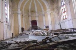 Maar wie dichterbij komt ziet dat de glorietijden voorbij zijn. In 1949 hield de bekende Spaanse gitarist Andres Segovia een concert in de kerk, nu hangen de vensters uit hun sponningen en vliegen duiven in en uit. Neogotische ornamenten zijn van de façade afgebrokkeld. En niets lijkt het verval te stoppen. De straat voor de kerk, in hartje Livorno, is hier smaller omdat er zware betonnen blokken met hoge metalen hekken zijn geplaatst en borden waarschuwen voorbijgangers voor neerstortend puin.