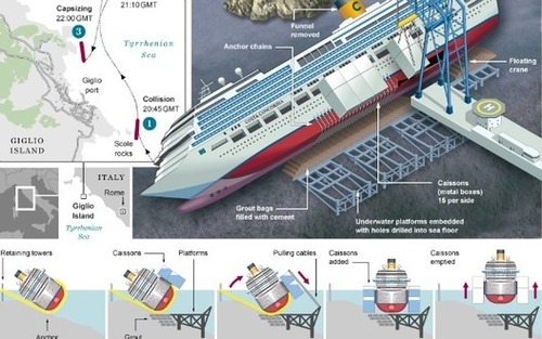 The operation will use a complex system of hydraulically driven jacks and steel cables to pull and push the ship off the rocks and set it upright.