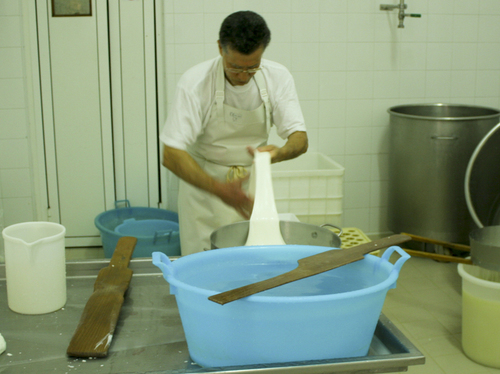 Making mozzarella at a farm dairy near Altamura: There are more than 400 different cheeses in Italy. Most of them are still made at small farm dairies. And there’s nothing like the taste of fresh mozzarella. Entering the small, farm dairy at masseria La Selva between Altamura and Matera feels like opening a forgotten page in a history book. In Denmark, 97% of all cheese and dairy products are supplied by a few huge co-operative dairy plants, while the Italians seem to have skipped the industrialization of dairy farming all together. La Selva still produces cheese and milk in a room next door to the stables, where a herd of 30-40 curious cows are munching hay. The distance from farm to fork is nonexistent.
