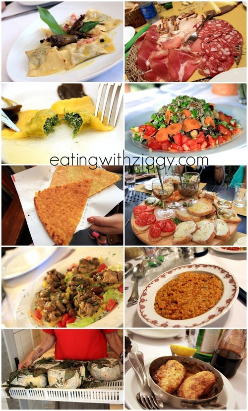 Pollo al Burro in Sostanza (Florence)Pappa al Pomodoro at Da Ruggero (Florence)Cecina at Da Felice (Lucca)Charcuterie Board at L’Incontro (Volterra)Pecorino at Podere Il Casale (Near Pienza)Ricotta and Spinach Ravioli at Il Pozzo (San Angelo in Colle)Bruschetta at Gattavecchi (Montepulciano)Insalata Lagumi at Da Roberto (Montisi)Polenta with Porcini at La Tellina (Siena)Ravioli with pigeon from Guastini (Valiano)