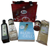 Een milieu vriendelijke en duurzame Italiaanse Koffie Tas, door de SWV gefabriceerd van gebruikt koffie verpakkingsmateriaal, gevuld met de literaire thriller BLOEDGELD (het debuut van Edward Hendriks) en voorzien van diverse Italiaanse producten van Good Things From Italy.