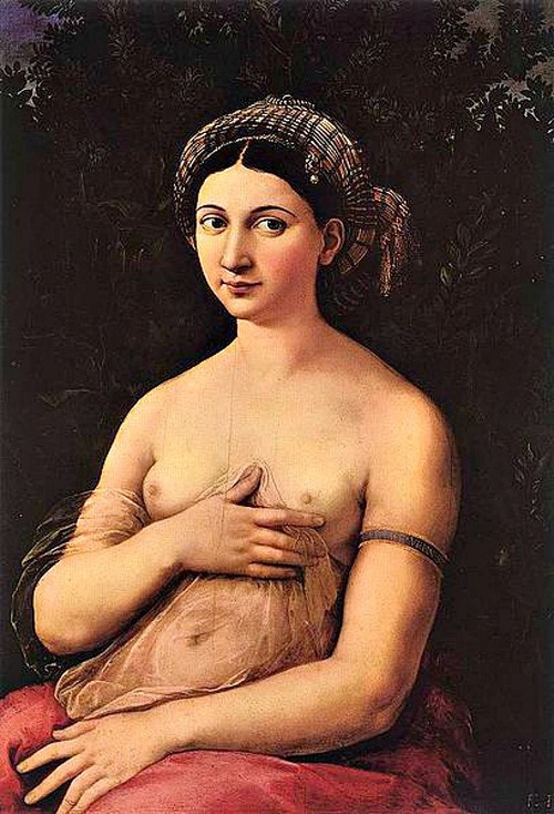 That the subject posed nude for Raphael is just one reason to think she might have been more than just a professional commission. Another hint: the fact that Raphael signed his name on the subject’s left armband, the arm connected to one’s heart. Or that her right hand is resting, gently, over her heart.