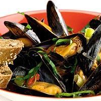 BEREIDEN Mosselen onder koud stromend water afspoelen. Geopende mosselen met bolle kant tegen aanrecht tikken. Blijft de mossel open, dan weggooien. Knoflook pellen en snipperen. In grote pan of mosselpan olie verhitten. Knoflook en roerbakmix 5 min. fruiten. Tomaten, wijn en mosselen toevoegen en afgedekt snel aan de kook brengen. Mosselen 7 min. koken totdat alle schelpen openstaan. Dichte mosselen verwijderen. Basilicum fijnsnijden. Mosselen en groenten op vier diepe borden scheppen en met basilicum bestrooien. Met stokbrood serveren. Lekker met knoflookmayonaise.