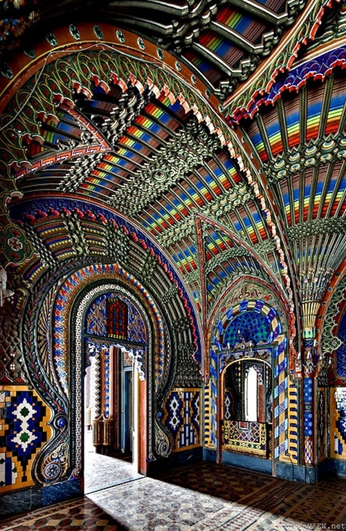 Just when you think that the architecture of today’s world is an amazing thing, take a look back at historical places and you truly have an appreciation for all of the hard work that was put in centuries ago, without all of the modern conveniences we have today. Italy’s Sammezzano Castle in Tuscany really puts that in perspective with its intricacies abound within each room.The Peacock Room in particular is one of the abandoned castle’s strong suites, with vibrant colors filling the floor to the fanned ceiling work. Originally built in 1605 and left alone to this day, the Sammezzano Castle houses all kinds of unforgettable Moorish woodwork, tiling and glorious painted pieces with an Art Nouveau look to keep the eyes busy for hours on end.