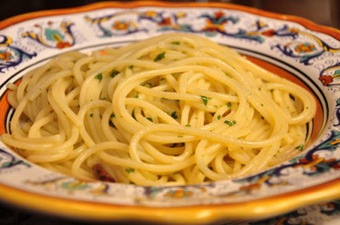 While the water is coming to a boil, sauté the garlic in the olive oil, along with the peperoncino, on low heat until the garlic is lightly golden brown, then turn off the heat. (Do not let the garlic burn, or it will turn bitter.) Add some chopped parsley at end (some people omit the parsley but I like the subtle flavor and color it adds).