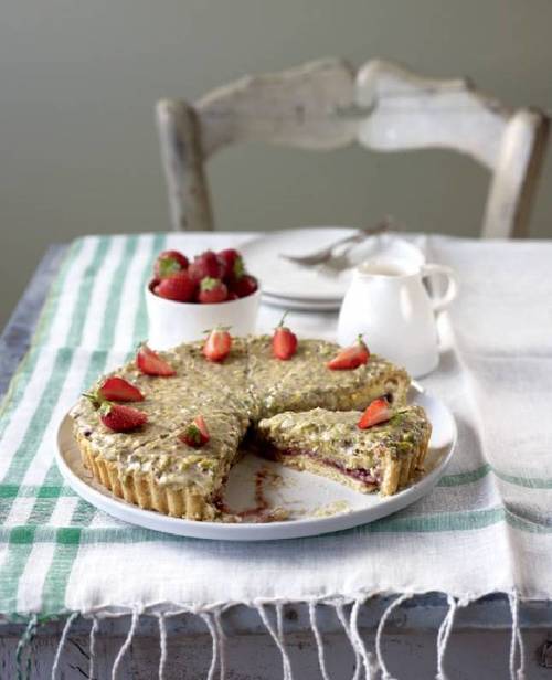 Ter ere van het driejarig bestaan trakteert Ciao tutti op aardbeien-amandeltaart met pistachevulling, uit het kookboek van Gino D’Acampo, De Italiaanse bakker thuis.