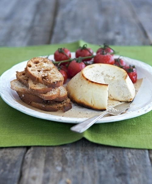 Verwarm de oven voor tot 220 ºC (gasovenstand 7). Leg de ricotta op een stuk bakpapier op de bakplaat, sprenkel er een beetje olijfolie over en bestrooi met zout en peper naar smaak. Rooster de ricotta in de voorverwarmde oven in zo’n 25 minuten goudbruin. Haal na 15 minuten de bakplaat uit de oven en leg de tomaatjes bij de ricotta. Besprenkel ook de tomaatjes met olijfolie en strooi de helft van het zeezout erover.