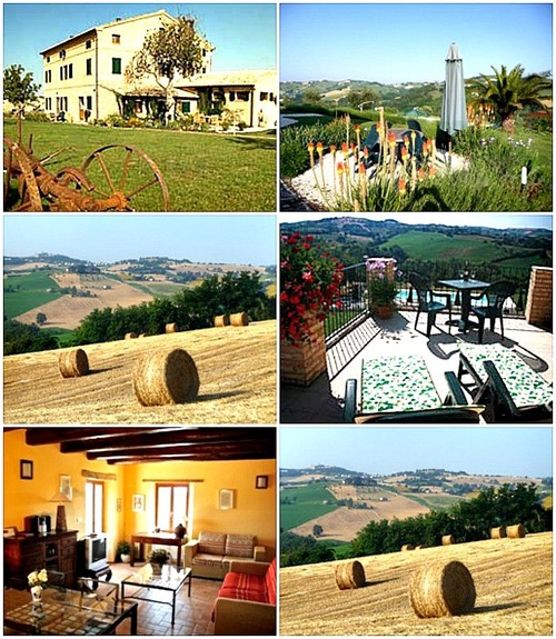 A traditional brick built farmhouse, casal(e), standing on the southern slope of a small valley in a hectare of landscaped gardens, orchards and olive trees. By the house are several large fig trees, fichi, which are abundant with fruit in June and October. We are surrounded by mixed farmland of sunflowers, corn, vines, olives and woodland. The medieval towns of Monte Giorgio and Monte San Pietrangelli sit atop the facing hills and