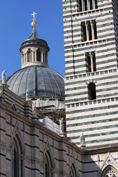 Al van ver buiten de stad zie je de zwart-wit gestreepte klokkentoren boven de rode daken van Siena uitsteken, als een trotse wachter die zijn directe omgeving continu in de gaten houdt. De toren hoort bij de Duomo, die de grootste kerk ter wereld had moeten zijn.