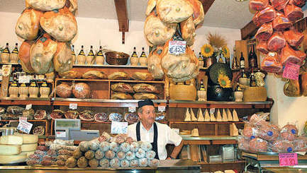 Winkeliers zijn hier geen verkopers, maar experten. Ze kijken je even in de ogen en kennen al jouw smaak. De rekken torsen er zoveel kaas - ja, uitsluitend Parmezaanse - dat men zich nog nauwelijks durft te bewegen. Plafonds buigen nog wat dieper door de vleeswaren die er hangen te wachten op publiek.