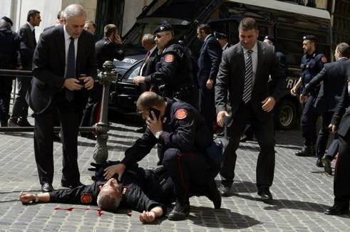 De nieuwe Italiaanse regering van premier Enrico Letta is zondag beëdigd in het presidentiële paleis. Een kilometer verder werd er geschoten voor het kantoor van de Italiaanse premier in Rome. Daarbij zouden volgens getuigen twee politieagenten gewond zijn geraakt.