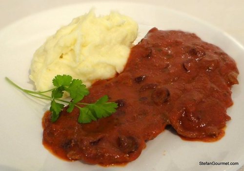 Alla Pizzaiola means something like “pizza style” and is not a clearly defined term in Italian cooking. The basic recipe for Carne alla Pizzaiola (meat pizza-style) is thin slices of meat (usually beef, but it can be prepared with other types of meat as well) cooked in a simple tomato sauce. To the tomato sauce you can add ‘pizza style’ ingredients like oregano, olives, capers, etc. It is a simple dish with a lot of flavor that in Italy is often served as piatto unico with mashed or roasted potatoes. It is easy to prepare, as you should only take care that you do not overcook the meat. An interesting point about carne alla pizzaiola is that in all the recipes that I have seen, the meat is not browned first.