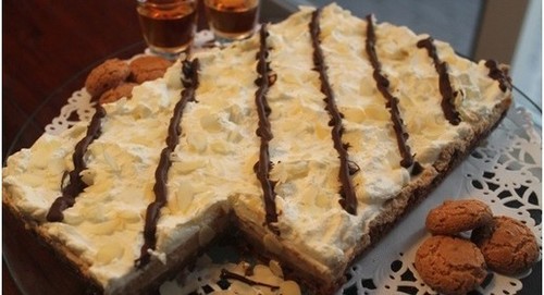 Uit het delicious bakboek maakte Lianne Janssen van Tante Thee een heerlijke taart met amaretto, slagroom en witte chocolade. Da leccarsi i baffi!
